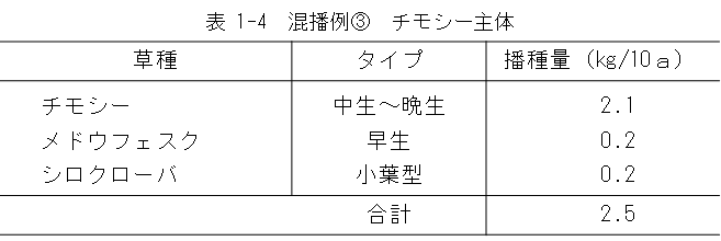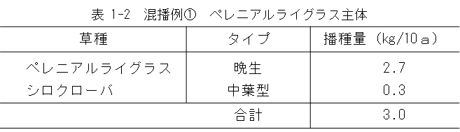 放牧地の混播設計は地域の気象条件や放牧地の利用方法(放牧専用地、兼用地、利用回数など)により決める必要があります。各草種の特性一覧を表 1-1に示しました。また、放牧地の混播設計については様々ありますが、当社が推奨する混播例①~③を以下に示しました。