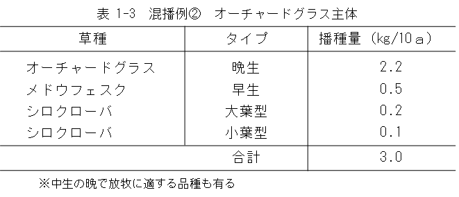 オーチャードグラス主体にメドウフェスクを補助草種としたものです(表 1-3)。オーチャードグラスとメドウフェスクの混播は季節生産性(春はオーチャードグラスの生育が良好、秋はメドウフェスクの生育が良好)のバランスが取れた組合せです。いずれも越冬性に優れる草種であるため、道東地域での利用に適しています。