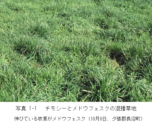 牧草の越冬条件が厳しい道東地域で利用されている混播例の一つです(表 1-4)。チモシーは秋の生産性が低下するため、それを補完する目的でメドウフェスク(越冬性はペレニアルライグラスやオーチャードグラスより優れる、秋の生産性が優れる)を混播しています(写真 1-1)。メドウフェスクを混播する場合は、チモシーとの競合力を考慮し、混播量を0.2kg/10a程度に抑える必要があります。