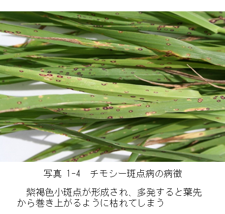 チモシーの葉枯性の重要病害として、チモシー斑点病が挙げられます。チモシー斑点病は冷涼多湿の条件で発生しやすく、北海道では道東地域に多い傾向があります。チモシー斑点病は冷涼多湿条件のほか、窒素などの肥料成分の不足によって発病が助長されます。チモシー斑点病の対策として、適切な肥培管理を行うことが有効であり、また、斑点病抵抗性が優れる品種の利用も有効です。