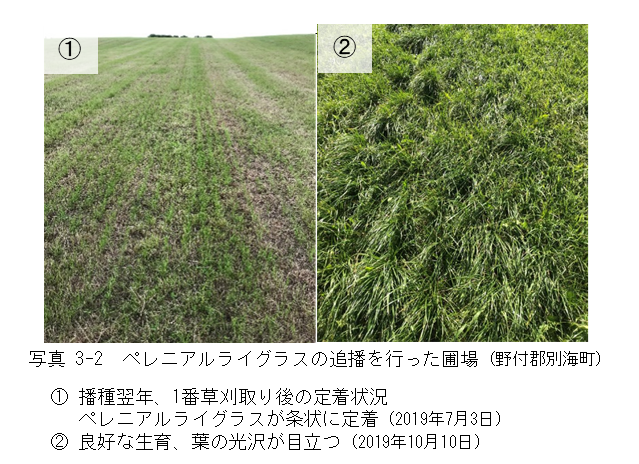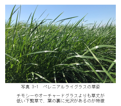 飼料成分はチモシーやオーチャードグラスより糖含量が高く、繊維含量が低い傾向にあります。道東ではペレニアルライグラスの冬枯れリスクが高いため利用を推奨されていませんが、飼料成分の向上を目的にペレニアルライグラスを利用する酪農家も増えています(写真3-2)。