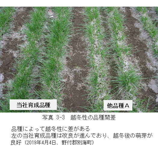 ペレニアルライグラスはチモシーやオーチャードグラスと比較して越冬性が劣る草種であり、越冬条件が厳しい地域では冬枯れするリスクが高くなります。ペレニアルライグラスの品種開発においては、越冬性が強くなるように改良されています。写真 3-3は、品種によって越冬性に差が出た時の様子です(雪腐大粒菌核病に罹病)。品種改良が進んでいる当社育成品種の方が、越冬後の萌芽が良好であり、収量が期待できます。冬枯れのリスクを避けるためにも、越冬性が優れる品種の利用を推奨します(道東地域を除く)。