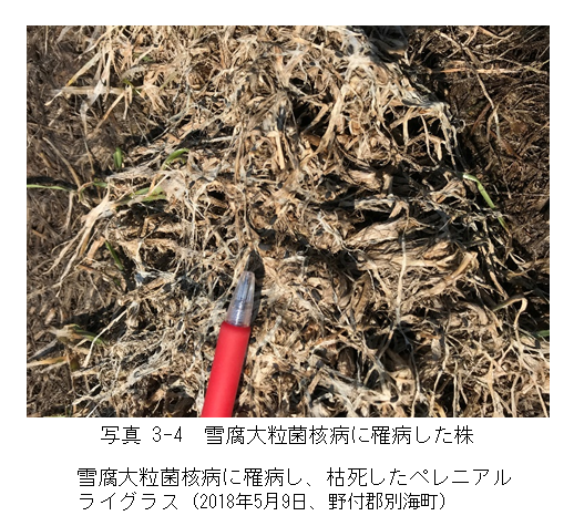 ペレニアルライグラスの病害では、雪腐病、網斑病、冠サビ病、葉腐病などがあります。特に、雪腐大粒菌核病は重要病害であり、根雪始が遅く、土壌凍結が厳しい年に多発します。加えて、融雪が遅くなると被害はさらに助長されます。雪腐病に罹病すると、枯死による裸地化や萌芽の遅れが発生し、被害が甚大な際には全面枯死に至ります。雪腐病に対しては、抵抗性が高い品種を利用することが推奨されます。また、殺菌剤の散布による対策も可能です。