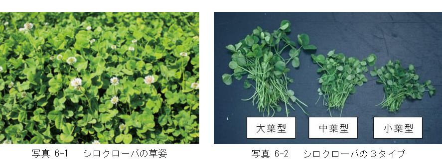 シロクローバは小葉の大きさにより大葉型、中葉型、小葉型の3つのタイプがあります(写真6-2)。小葉が大きいほど生育が旺盛であり、混播するイネ科牧草に合わせてシロクローバのタイプを使い分ける必要があります(表 6-1)。