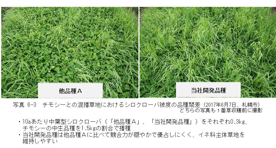 シロクローバの使い分けについては、地域や播種時期、土壌条件などによっても変わります。例えば、根釧などの冷涼地域ではマメ科牧草が衰退しやすいため、チモシーの早生品種に大葉型のシロクローバを混播する場合もあり、逆にチモシーの生育が抑圧されてマメ科牧草が優占しやすい条件では、チモシーの早生品種に小葉型のシロクローバを混播する場合もあります。