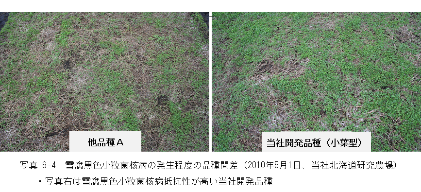 他の草種と同様に雪腐病が北海道における重要病害です。罹病すると、融雪後に小葉は海苔状になって腐り、匍匐茎は凍害で枯死します(写真6-4)。越冬性に関与する要因として、雪腐病のほかに耐寒性があり、これらに対する強弱には品種間差があります。また、近年では越冬性や永続性を改善した品種の開発が進んでいます。
