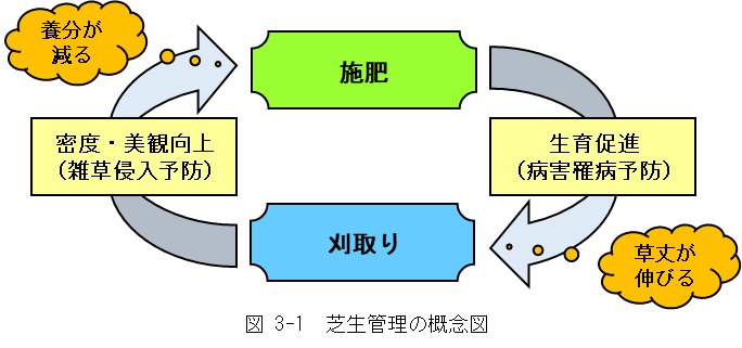 芝生管理は、施肥から始まります。施肥をすると生育が促進され、病害罹病の予防になります。施肥をすると草丈が伸びるため、刈取りを行います。芝生は刈取られることで密度が高まり、雑草侵入の予防になります。刈取りをすると養分が少なくなるため、また新たに施肥を行います。このサイクル(図 3-1)が崩れると、病害に罹病し、雑草が多く、美観の低い芝生になってしまいます。