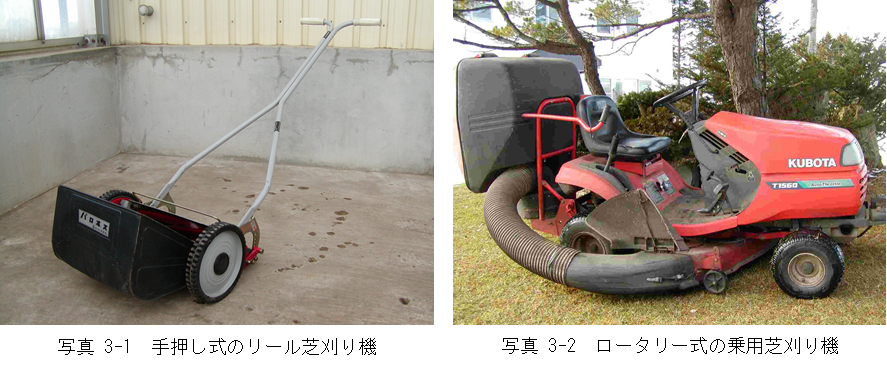 芝刈り機は、リール式(回転刃と下刃の噛合わせにより刈取る)とロータリー式(プロペラ状の回転刃で叩き切る)があり、どちらも手押し式(写真 3-1)と自走式があります。数100㎡規模の大面積の芝生管理には乗用の芝刈り機(写真 3-2)が便利です。