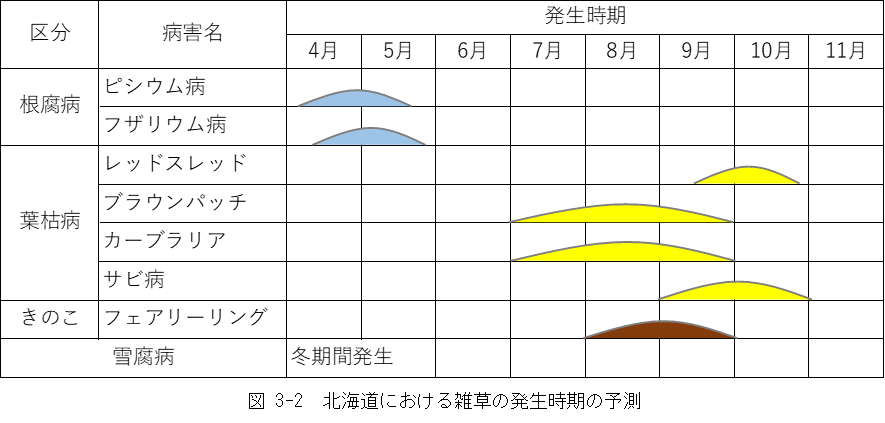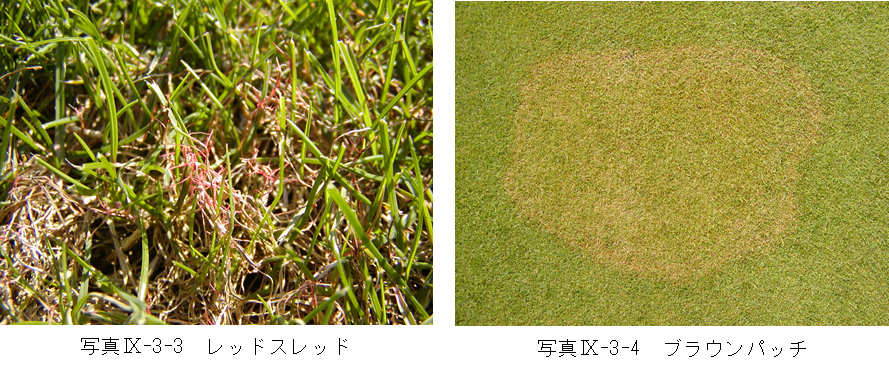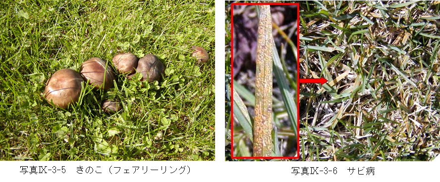 芝草の病害の多くは、肥料不足や過剰、排水不良、高温多湿、サッチ(未分解有機物)の集積など、芝草が健全に生育していない時に罹病します。最適な管理をしていれば、病害で枯死することは殆どありません。罹病が甚だしい時は、病害に対して効果のある殺菌剤を散布します(図 3-2、写真 3-3~3-8)。