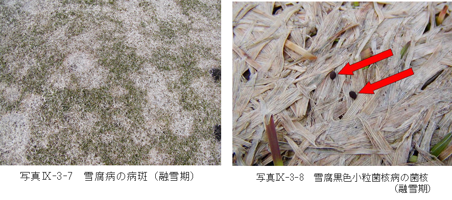 なお雪腐病の殺菌剤散布は11月中旬~下旬であり、融雪後には防除できません。病斑は、施肥と刈込みで回復させます。ケンタッキーブルーグラスは多少罹病しますが、無殺菌でも越冬できます。