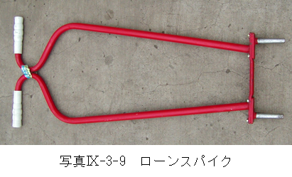 通気性の改善、土壌固結の緩和などを目的に、ローンスパイク(写真 3-9)またはフォークなどを利用して、コアリング(穴あけ)を行います。芝草の生育を見ながら、通常は年に1~2回、芝草の生育が盛んな時期に行います。