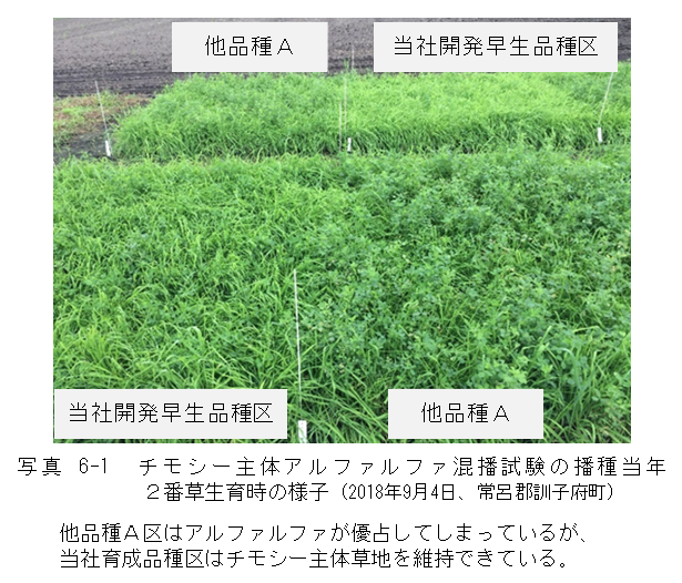 アルファルファは初期生育が緩慢ですが、十分に生育した株の再生力は旺盛です。再生力の強さに応じて競合力も変わります。再生が旺盛で競合力が強い品種は、チモシーの早生品種やオーチャードグラスとの混播利用に適しています。一方で、生育が旺盛すぎるためにチモシーの生育を抑圧してしまう事例もあります。当社では生育が緩慢で従来品種よりも競合力が穏やかな、チモシーの中生品種との混播も可能な早生タイプのアルファルファの育成も手掛けています(写真6-1)。