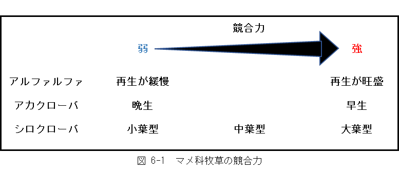 イネ科牧草の各草種に対して、組合せが適するマメ科牧草を表6-1に示しました。表は基本的な組合せですが、土壌条件や気象条件によってはマメ科牧草の生育量が異なるため、ここに示した組合せが全てではありません。播種量などを含め、具体的な混播設計についてはお近くの営業所へお問い合わせください。