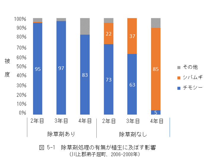5-1はプラウ耕起前にグリホサート系除草剤を散布した区(除草剤有り)と散布しない区(除草剤無し)を設置し、その後の植生の推移を調査した結果です。除草剤を散布した区は4年目調査でほとんどシバムギが無いのに対し、除草剤を散布しなかった区は4年目にはシバムギが85%に達し、再び優占してしまいました。