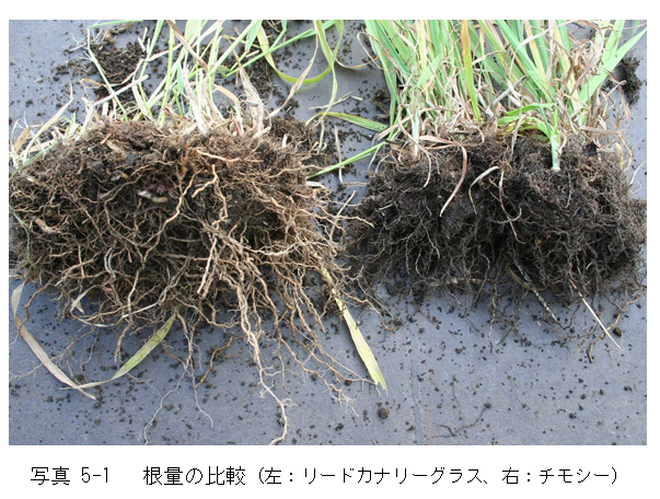 更新時はプラウで耕起する前にグリホサート系除草剤で前植生を完全に枯らすことが最も大切なポイントです。また、除草剤の濃度は適用範囲内において高濃度で散布することが推奨されます。地下茎型イネ科雑草は根量が多いため、根までしっかり枯らすには十分な薬量が必要になります(写真5-1)。