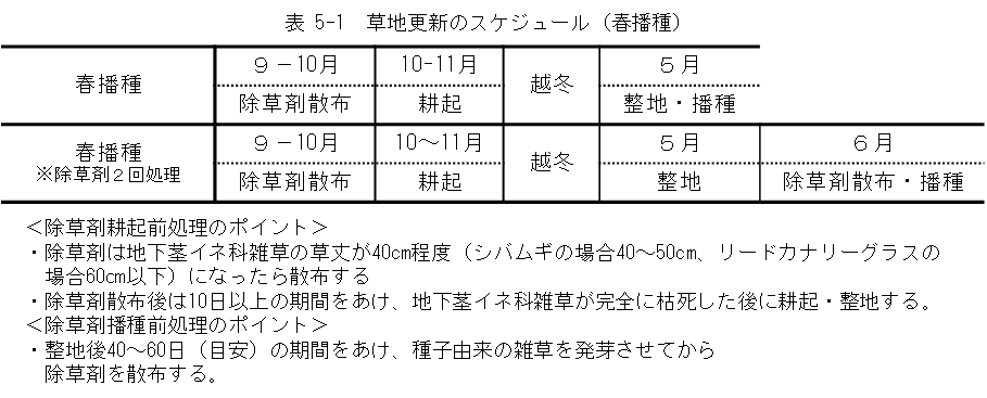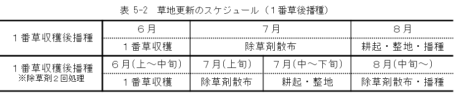 地下茎型イネ科雑草対策を踏まえた草地更新のスケジュール例を表 5-1、表5-2に示しました。各スケジュールのポイントは以下のとおりです。