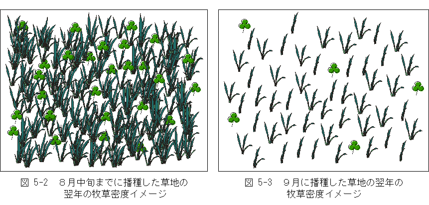 一般に北海道では8月末までの牧草播種が原則ですが、地域によっては9月に入ってからの播種も見られます。播種が遅れた場合は、発芽や初期生育が緩慢となり、播種当年の分げつ数も少なくなることから、草地の密度は低下し、雑草が侵入しやすくなります(図5-2、図 5-3)。