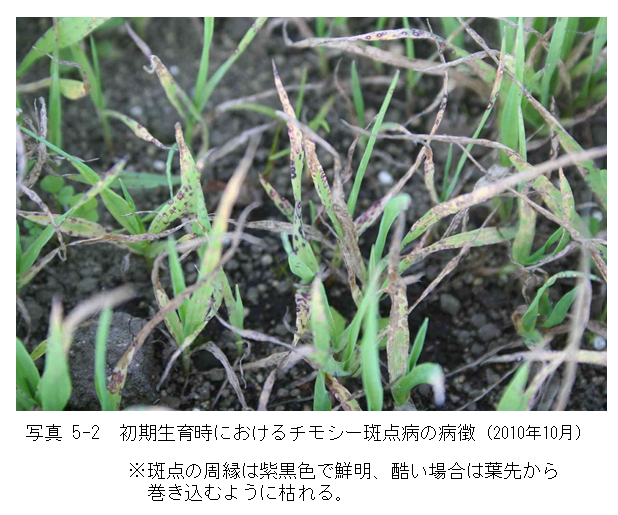 更新時にプラウ耕起で更新した場合、痩せた下層土がプラウで表層に反転されて播種床となるため養分が不足していることが多く、チモシー斑点病の発生がしばしば見られます(写真5-2)。チモシー斑点病は窒素やカリなどの養分不足と冷涼多湿な気象条件で多発するため、特に根釧地域において久しぶりに更新した草地などで多く見られます。初期生育時にチモシー斑点病の発生が見られた場合、追肥を行うことによって、牧草の生育は回復します。