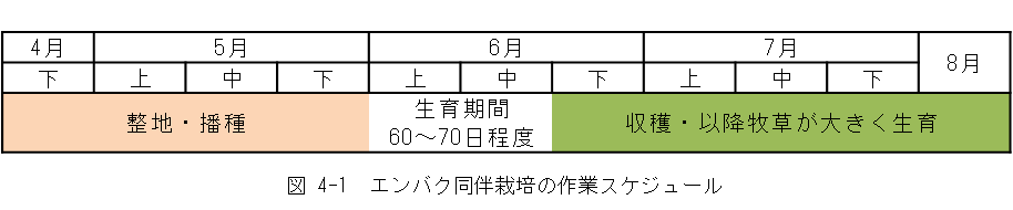 作業スケジュールを図4-1に示します。播種は5月中に済ませ、生育期間は60~70日程度が目安です。エンバクを収穫した後に牧草が再生し、草地として利用できるようになります。播種が遅れると草丈が短い状態で出穂し、低収になります。