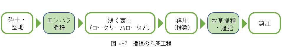 - 鎮圧した後、牧草を通常の播種量で播種し、再度鎮圧を行う。