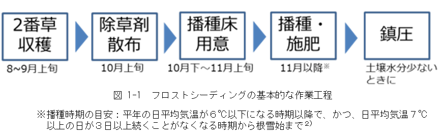 播種する際に必要な作業工程は、通常の草地更新と大きくは変わりありません。図1-1に基本的な作業工程を示しました。播種機はブロードキャスター、グラスシーダー、作溝型播種機(簡易更新や追播の場合)など、いずれの機械でも施工できます。1番草収穫後に更新作業を開始する夏播種とは異なり、2番草まで収穫を行ってからの更新作業となるため、収量の確保が可能です。また、既存植生に対しグリホサート系除草剤を秋に散布することになりますが、地下茎型イネ科雑草に対する除草剤の効果は、秋散布が優れることが報告されており1)、雑草対策にも有効と考えます。
