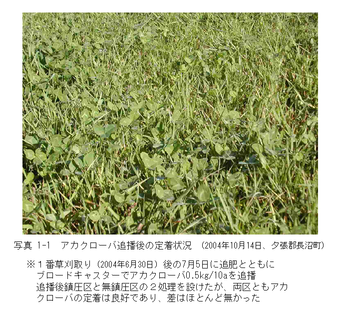 マメ科牧草は発芽する温度がイネ科牧草より低いため、11月上~中旬に播種した場合でも、発芽し、その後枯死します。フロストシーディングはイネ科牧草の単播が基本です。マメ科牧草を入れる場合は翌年以降に追播します(写真1-1)。