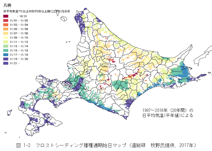 播種時期に関しては、目安として「平年の日平均気温が6℃以下になる時期以降で、かつ、日平均気温7℃以上の日が3日以上続くことがなくなる時期から根雪始まで」とされています2)。近年の不安定な気象環境もあり、的確に施工可能なタイミングを捉えることは少々難しいかもしれませんが、北海道立総合研究機構による研究の成果で、各地(1kmメッシュ)の播種適期始日やその期間などの情報がマップ化され3)、以前よりも取り組みやすくなってきています(図1-2)。