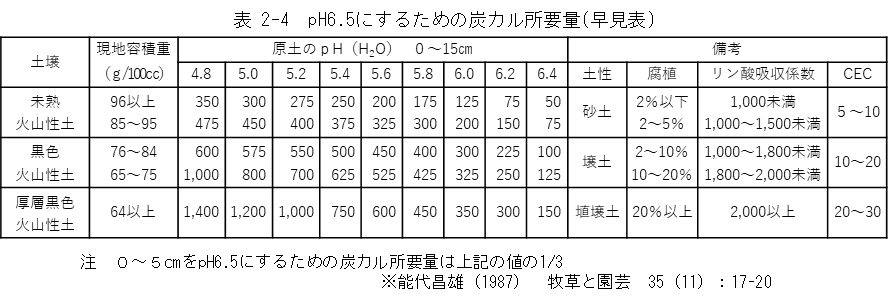 土壌pHが6.0以下であれば、維持管理時においても定期的に炭カル等の土壌改良材を投入し、土壌pHを維持することが必要です。pH5.5~6.0の場合は、40kg/10a/年とされており、2~3年分を一括施用することも可能です。pH5.5未満の場合、0~5cm土層のpHを6.5に改良するのに必要な量を投入します(表2-4)。