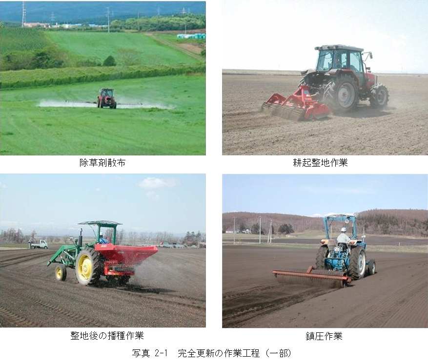 硬くなった土壌の通気性や透水性を改善するために必要です。ルートマットや雑草を鋤き込み、耕土を深くすることで牧草の発芽と定着が良くなります。 - ④ディスクハロー、パワーハロー、ロータリーハローによる砕土