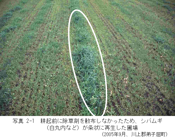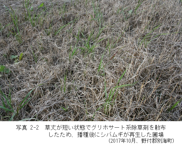 - 更新前草地に地下茎型イネ科雑草(シバムギ、リードカナリーグラス、レッドトップ、ケンタッキーブルーグラスなど)が多い場合は、プラウ耕による埋没処理では不十分なことが多く、耕起後に再生してきます(写真 2-1)。この場合、耕起前にグリホサート系除草剤を十分に散布し、完全に枯殺してから耕起する必要があります。グリホサート系除草剤を散布する際は、牧草や雑草が十分に伸びた状態で散布する必要があります(イネ科雑草の草丈40cm程度が目安)。地下茎型イネ科雑草の草丈が目安よりも短い状態で除草剤を散布すると、効果が不十分でこれらの雑草が再び発生してくる場合があります(写真 2-2)。