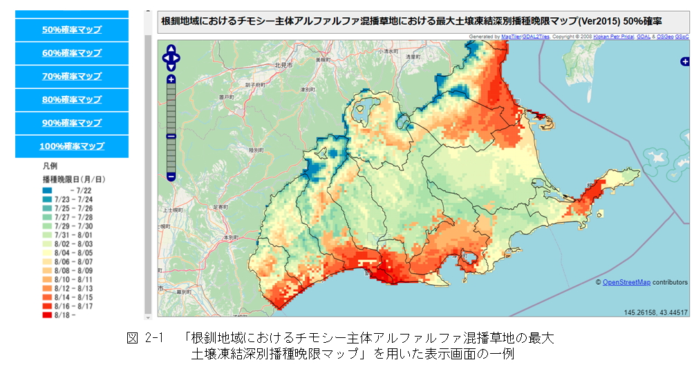 このシステムを用い、根釧地域のチモシー主体アルファルファ混播草地の播種晩限を調べた一例を図 2-1に示しました。地図は拡大表示が可能であるため、播種を検討している圃場の位置に応じた播種晩限を調べることができます。