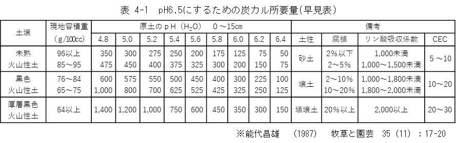 トウモロコシの栽培適地においてはスラリー、堆肥などを鋤きこみながら数年間栽培した後にアルファルファを播種すると、初年目のスタンド確立が容易にできます。堆肥はカリの含量が高く、次いで窒素、最も少ないのはリン酸です。カリはアルファルファを維持するためには十分な量が必要であり、窒素も根粒の着生が不良な時には施肥しなければならない肥料分です。このように考えると牛の糞尿はアルファルファに適した有機質肥料といえます。また、造成・更新時には十分なカルシウムを施用する必要があります。目標pHは6.5以上であり、施用する目安は表 4-1の通りです。