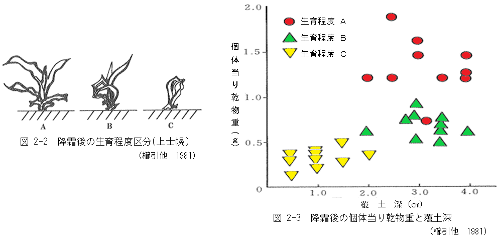 - 生長点を保護するように深めに播種すると、晩霜の被害を軽減できます(図 2-2、2-3)。