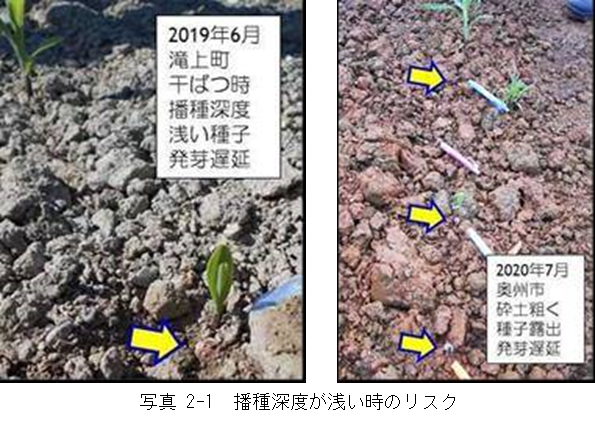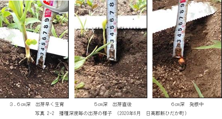- 播種深度が5cmより深いと、出芽が遅れます。播種後に鎮圧を行った場合はさらに遅れる可能性があります(写真 2-2)。