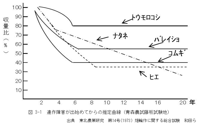 トウモロコシは連作に強い作物といわれていますが、3~4年の連作で15~20%減収します(図 3-1)。以下の要因により連作障害が発生します。