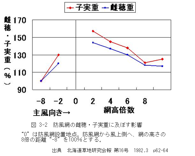 風によりトウモロコシが倒伏・折損すると、雌穂登熟の妨げや収穫ロスの発生により減収することがあります。防風網を設置することで、雌穂・子実重が増加するという報告もあることから、風のあたりの強さがトウモロコシに与える影響が大きいことが分かります(図 3-2)。風当りの強い畑で栽培する場合は、倒伏に強い品種や登熟が早い早生品種を選択します。