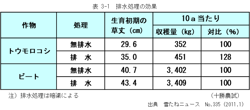 トウモロコシは湿地には弱い作物です(表 3-1)。また水はけが悪いと出芽不良や根張りの悪化を招きやすく、根腐病などの土壌病害リスクも高まります。明渠や暗渠の設置、サブソイラによる心土破砕など排水対策を確実に行います。