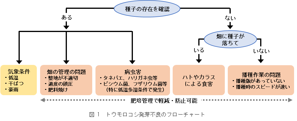 トウモロコシの発芽や出芽の不良は、低温・旱魃などの気象条件や肥培管理が不適切な場合に発生します。ほとんどの場合は肥培管理で改善できます。