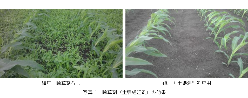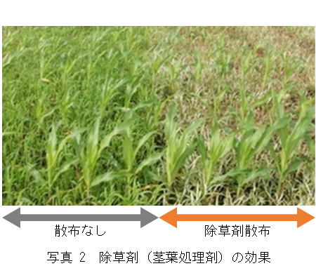 雑草に直接かけることにより、雑草を枯殺します。選択性(特定の草種のみ枯らす)と非選択性(草種を問わず全部枯らす)があります。栽培期間中は、飼料用トウモロコシに対して登録のある選択性の茎葉処理剤を使用します。収穫まで雑草の発生を軽減できます。