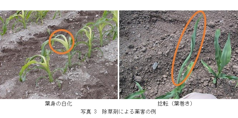 除草剤を散布後に生育停滞や、葉身の白化、ちぢれ、捻転(葉巻き)などの症状が発生し、ひどいときは葉身が褐色化し枯死に至ることがあります。