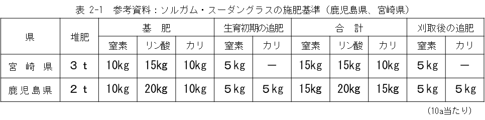 施肥管理はまず各県の施肥基準を参考にします。細切サイレージ利用の場合は、概ね飼料用トウモロコシと同様の施肥管理です。青刈りやロールベール利用で出穂前に収穫する場合は、細切サイレージ利用や飼料用トウモロコシの施肥量の3分の2程度を目安にします。