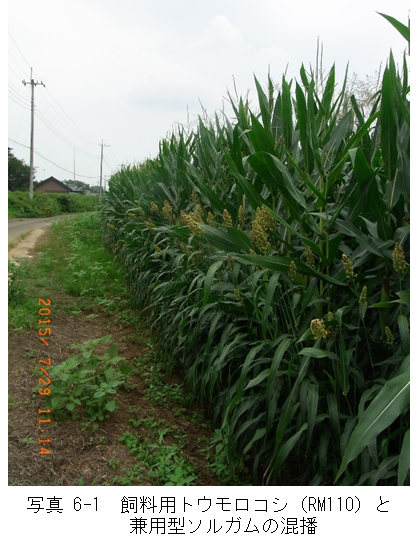 - 除草剤はトウモロコシとソルガムの両方で登録されているものを使用します。特にトウモロコシ用の選択性茎葉処理剤は、ソルガムにかかると枯れてしまいますので、土壌処理剤による防除が主となります。ある程度生育するとソルガムにより条間が被覆されるため、トウモロコシ単播に比べると雑草は生えにくくなります。