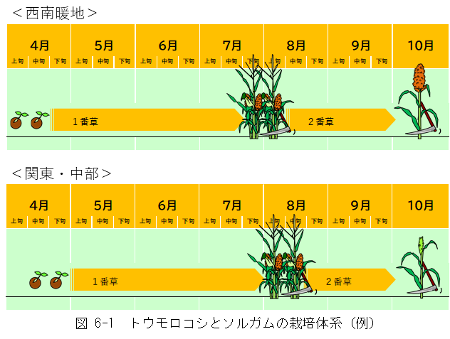 トウモロコシの早播きの適期に合わせてトウモロコシとソルガムを混播すると、生育に適した温度帯の違いにより、トウモロコシが優先して生育します。夏にトウモロコシを収穫すると、その陰で細々と生育していたソルガムが再生し、秋口に2番草を収穫することができます。このように、1度の播種作業で2毛作並の多収を得られることが、トウモロコシとソルガムの混播栽培の利点です。